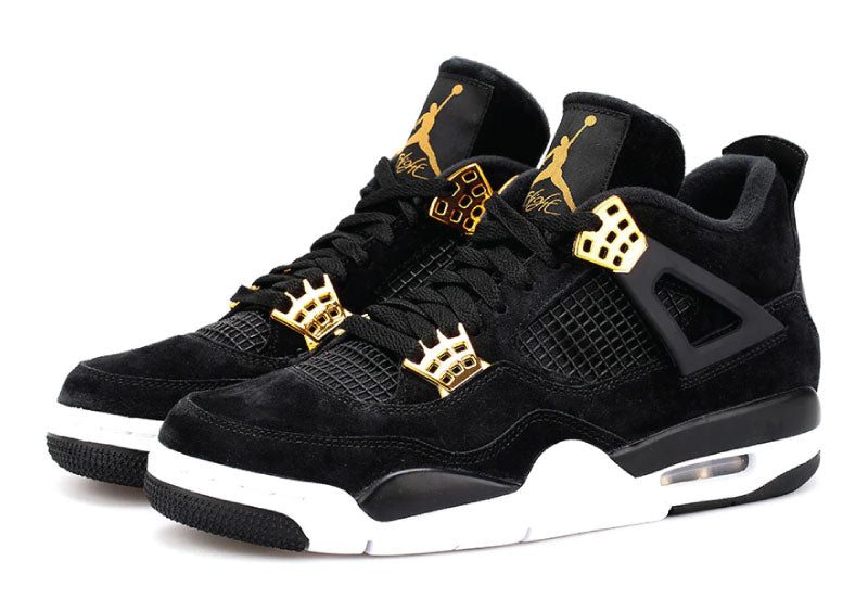 With its high-end black leather upper and elegant gold accents on the eyelets, tongue logo, and heel tab, the Air Jordan 4 Retro Royalty Black radiates luxury and sophistication. With its distinctive Air-Sole cushioning for optimal comfort, these regal trainers provide the ideal balance of luxury and athletics. Long-lasting wear and support are guaranteed by a sturdy rubber outsole. For people who value style and elegance in their footwear, the Royalty Black delivers a high-end appearance with the distinctive AJ4 design, whether you're looking to add to your collection or find a standout piece.